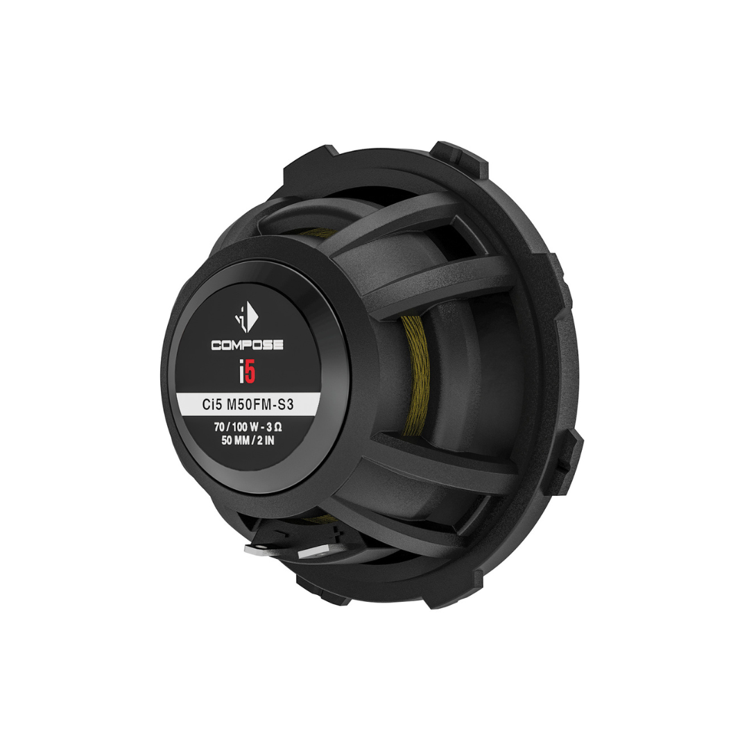 El Ci5 M50FM-S3 amplía la plataforma COMPOSE con un avanzado altavoz de banda ancha de 2″ que convence por su diseño excepcionalmente compacto. Gracias a su diámetro exterior notablemente reducido en comparación con los altavoces de 2″ típicos, así como a la tecnología FlexMount, el Ci5 M50FM-S3 puede instalarse incluso en espacios reducidos. Esto lo hace especialmente adecuado para instalaciones donde las limitaciones de espacio, los ángulos de montaje desfavorables o las limitaciones de la carcasa dificultan la implementación de configuraciones convencionales de dos o tres vías.
