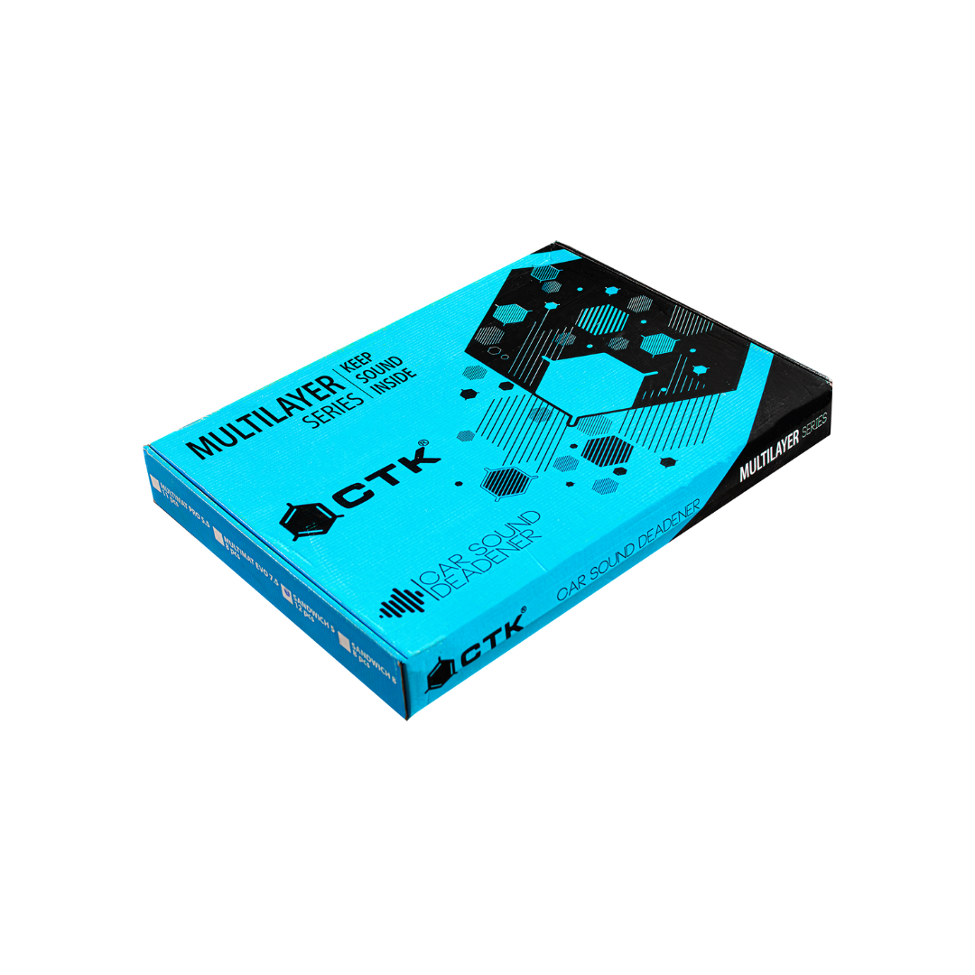 CTK Sandwich es un material multicapa combinado. Consiste en el material insonorizante CTK Premium, fabricado con un compuesto de caucho butílico de alta calidad, lámina de aluminio gofrado de 100 micras de espesor (0,1 mm), y el material absorbente de ruido CTK Elastic, un material absorbente de ruido.